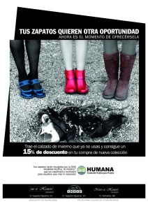 HUMANA Fundación Pueblo para Pueblo colabora en la campaña de Calzados Ambar Tus zapatos quieren otra oportunidad. Ahora es el momento de ofrecérsela, mediante la cual los clientes de la cadena que donen su calzado usado pueden obtener un 15% de descuento en la compra de la nueva colección. Calzados Ambar cuenta con tres establecimientos en Madrid: dos en la calle Augusto Figueroa y uno en la calle Hortaleza.