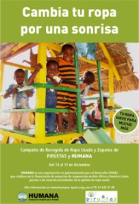 HUMANA y la Guardería Piruetas, de Parla, han puesto en marcha una campaña de recogida de ropa usada y zapatos, que tendrá lugar del 13 al 17 de diciembre, con el lema ‘Cambia tu ropa por una sonrisa’.