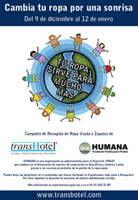 sta el 12 de enero el Grupo Transhotel y Humana están llevando a cabo una campaña de recogida de ropa usada en la sede central de la compañía, situada en San Sebastián de los Reyes, bajo el lema de ‘Cambia tu ropa por una sonrisa’.