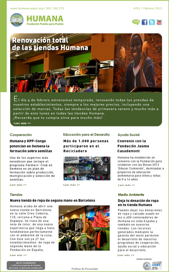 Seguimos adelante con nuestro objetivo de ofrecerte cada vez más y mejor información sobre la actividad que desarrollamos: el pasado viernes enviamos el número 1 de Humana News, la Newsletter de la Fundación. Para suscribirte, envía un e mail a news@humana-spain.org