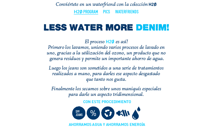 Hemos descubierto una línea de productos de Springfield Jeans, asociada a la campaña H20: los vaqueros comercializados bajo esta marca presumen de haber sido fabricados mediante un proceso que supone un menor consumo de agua. Porque cada gota de agua cuenta.